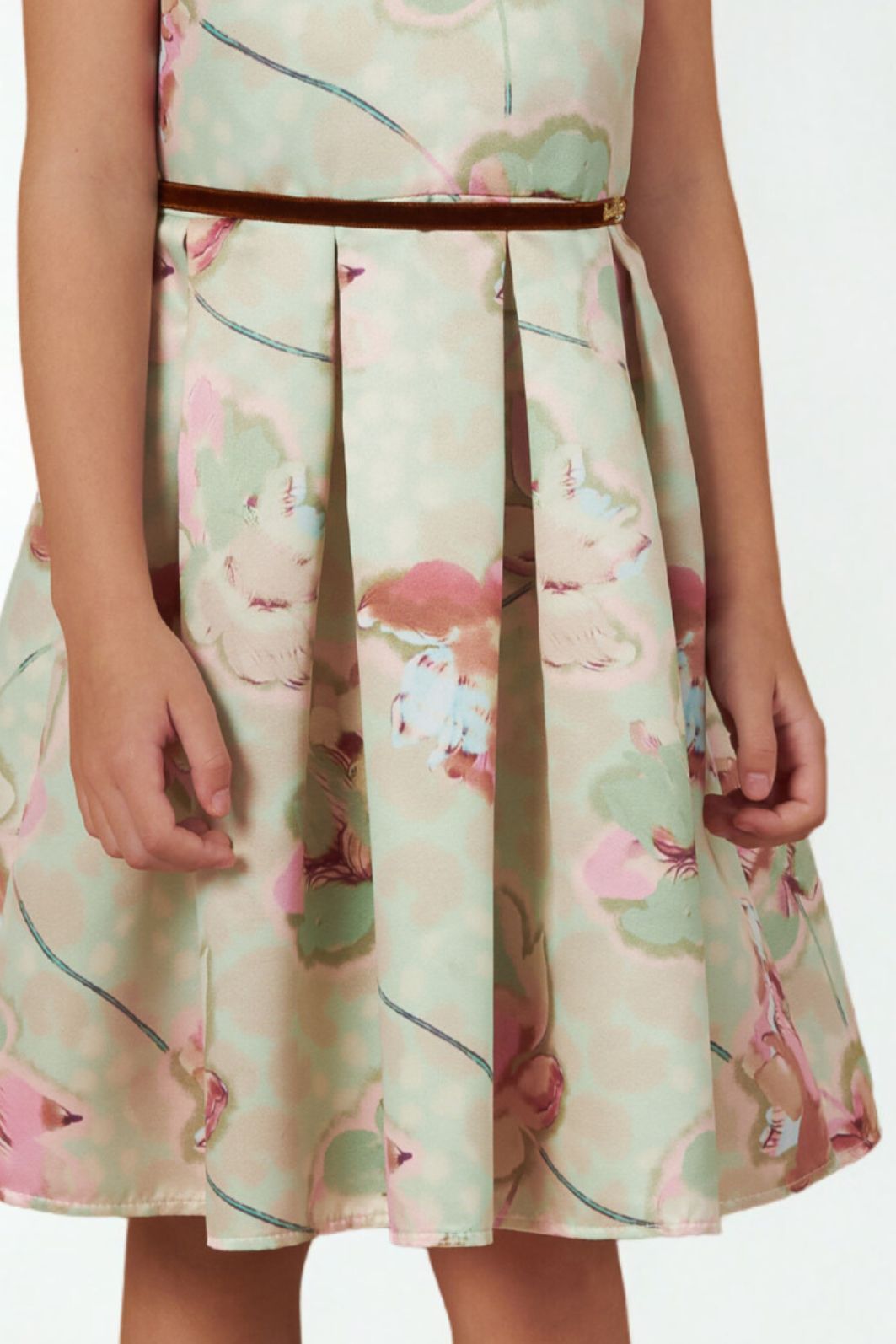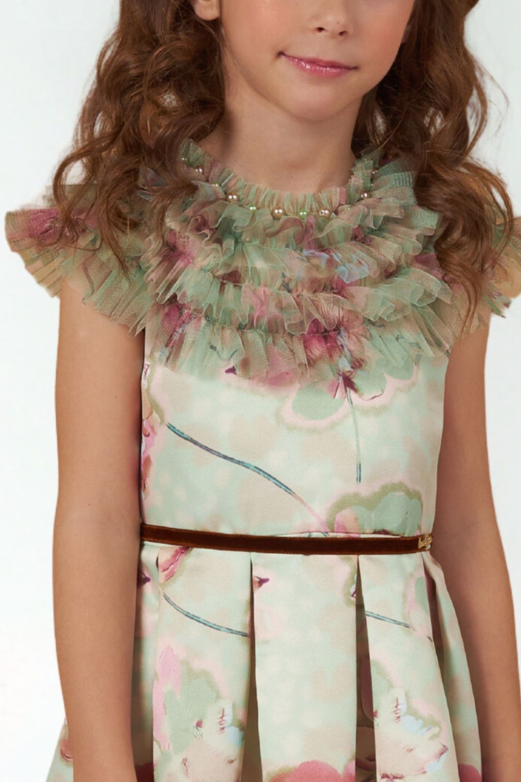 Descrição | Vestido infantil em tecido de cetim bucol com estampa floral, modelagem evasê e pregas frontais. Possui gola e mangas com babados em tule, agregando volume e delicadeza ao visual. Cintura marcada com fino cinto de veludo. Peça leve, confortável e ideal para ocasiões especiais, combinando elegância e charme infantil. |