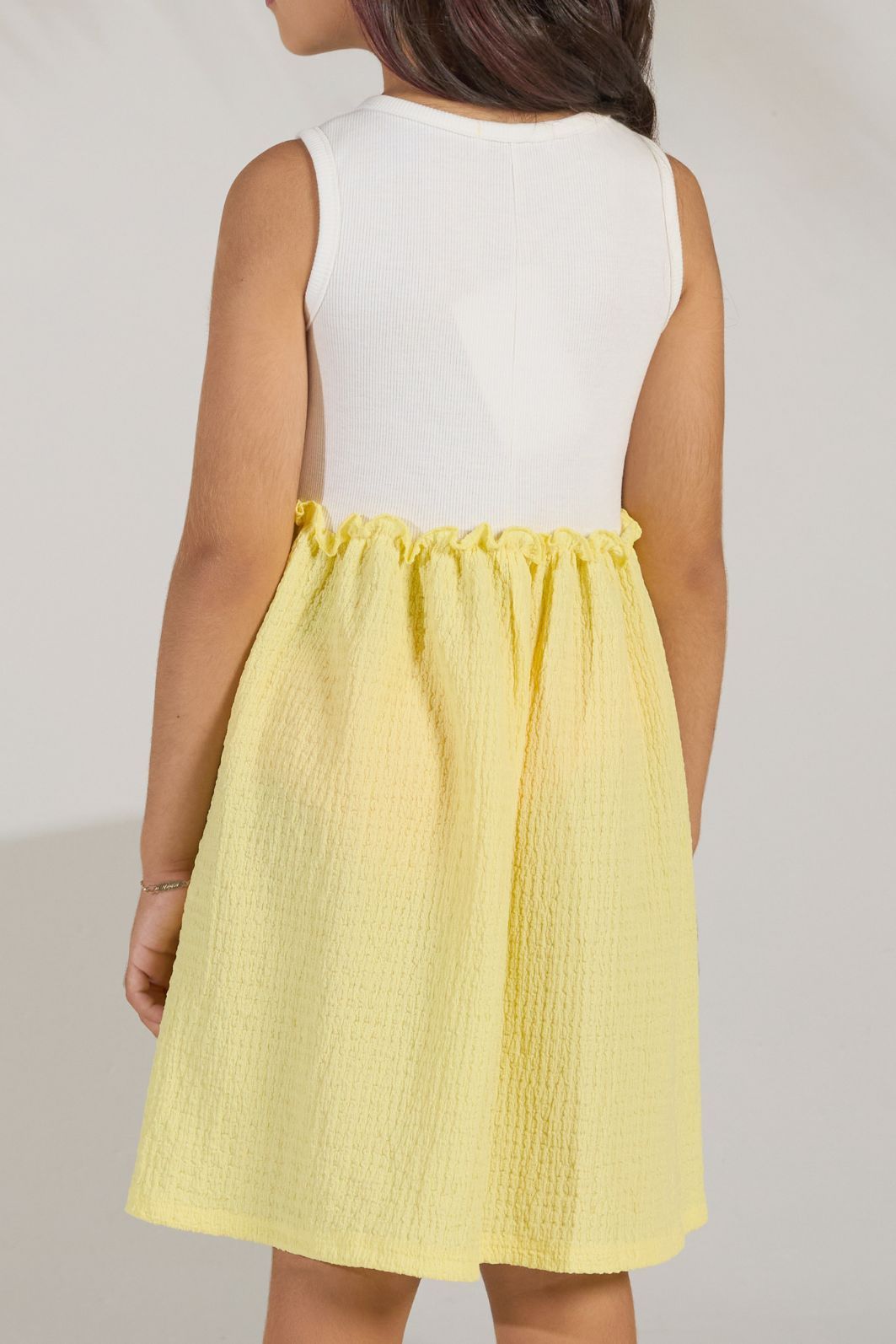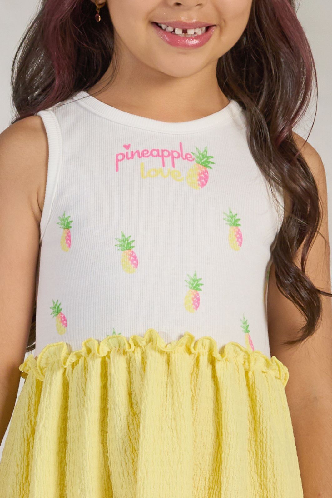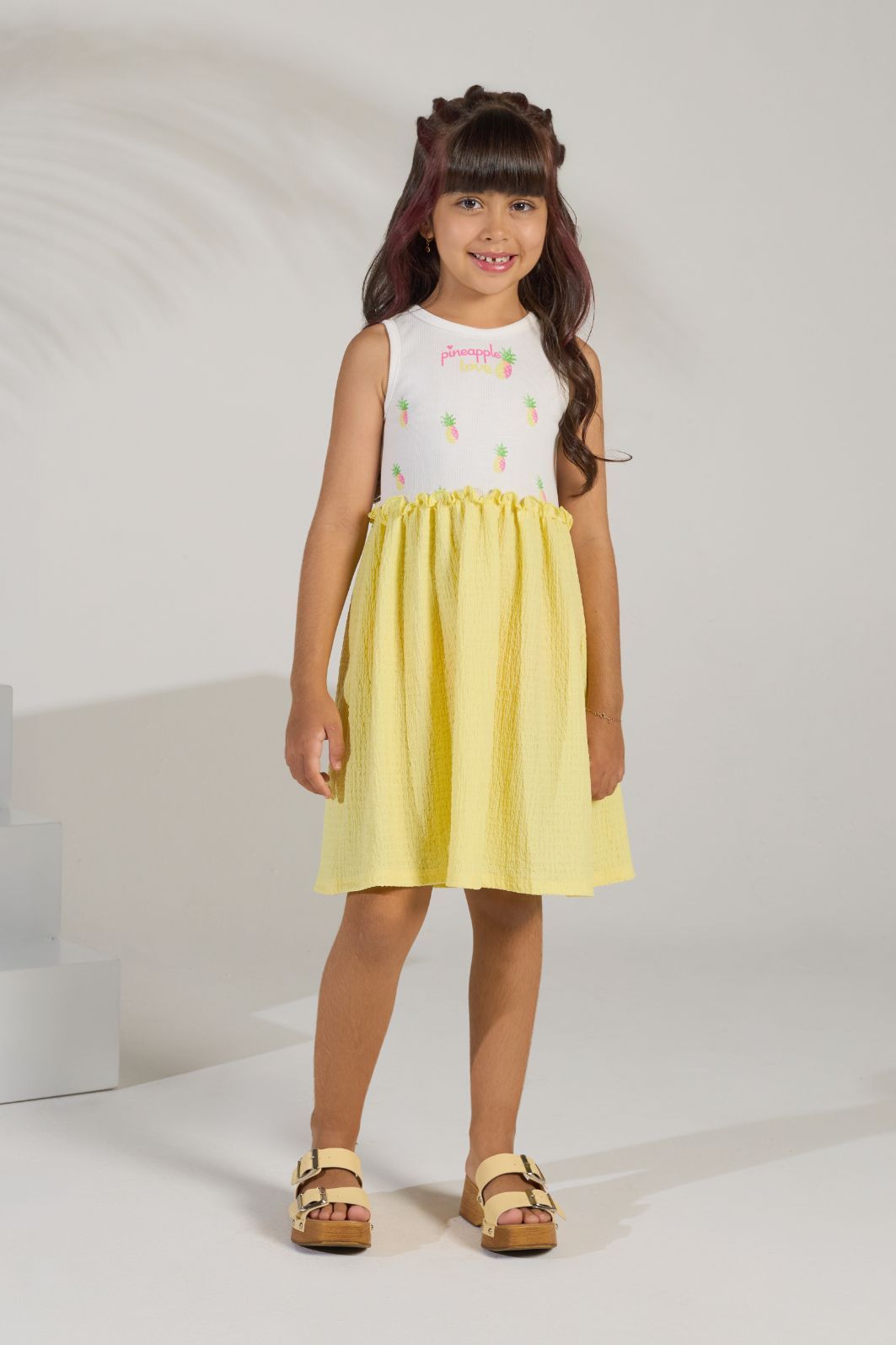 | Descrição | Vestido infantil feminino confeccionado em tecido leve, modelo sem mangas, com corpo em cor contrastante e estampa frontal em silk de abacaxi. Possui cintura franzida e saia rodada, garantindo conforto, liberdade de movimento e visual alegre, ideal para uso diário e dias quentes. |