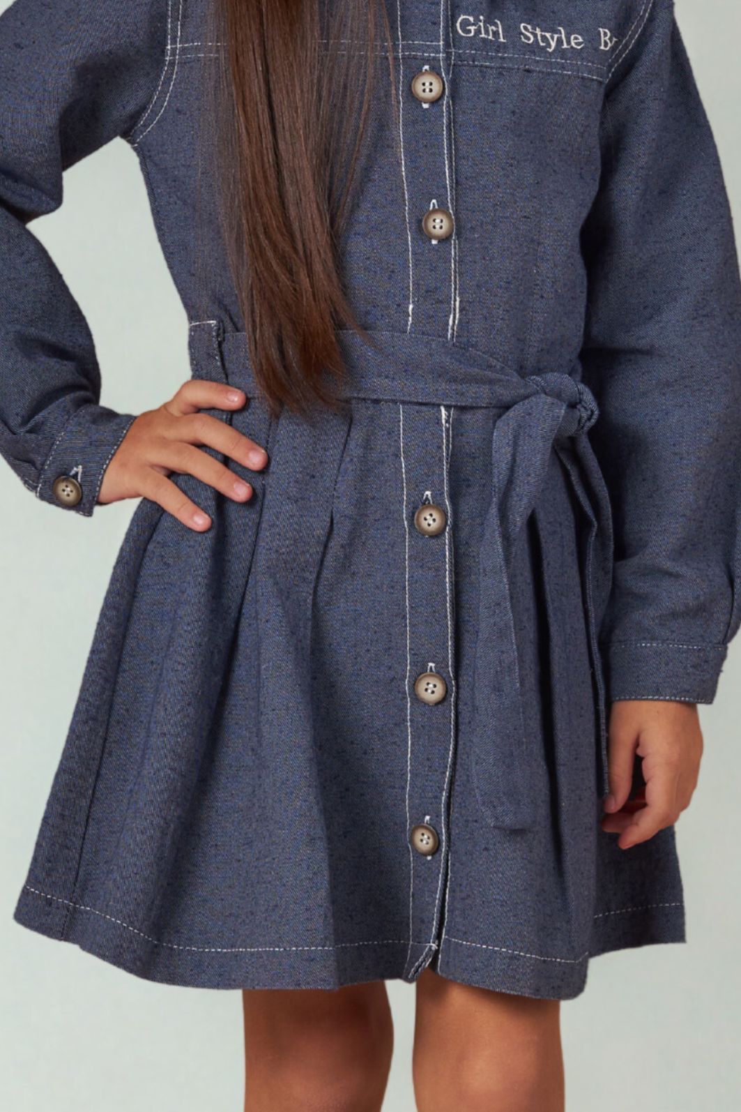 | Descrição | Vestido infantil em jeans azul, com modelagem evasê e mangas longas. Apresenta gola polo, fechamento frontal por botões metálicos e faixa para amarração na cintura. Possui costuras aparentes e bordado frontal, garantindo visual moderno e confortável. |