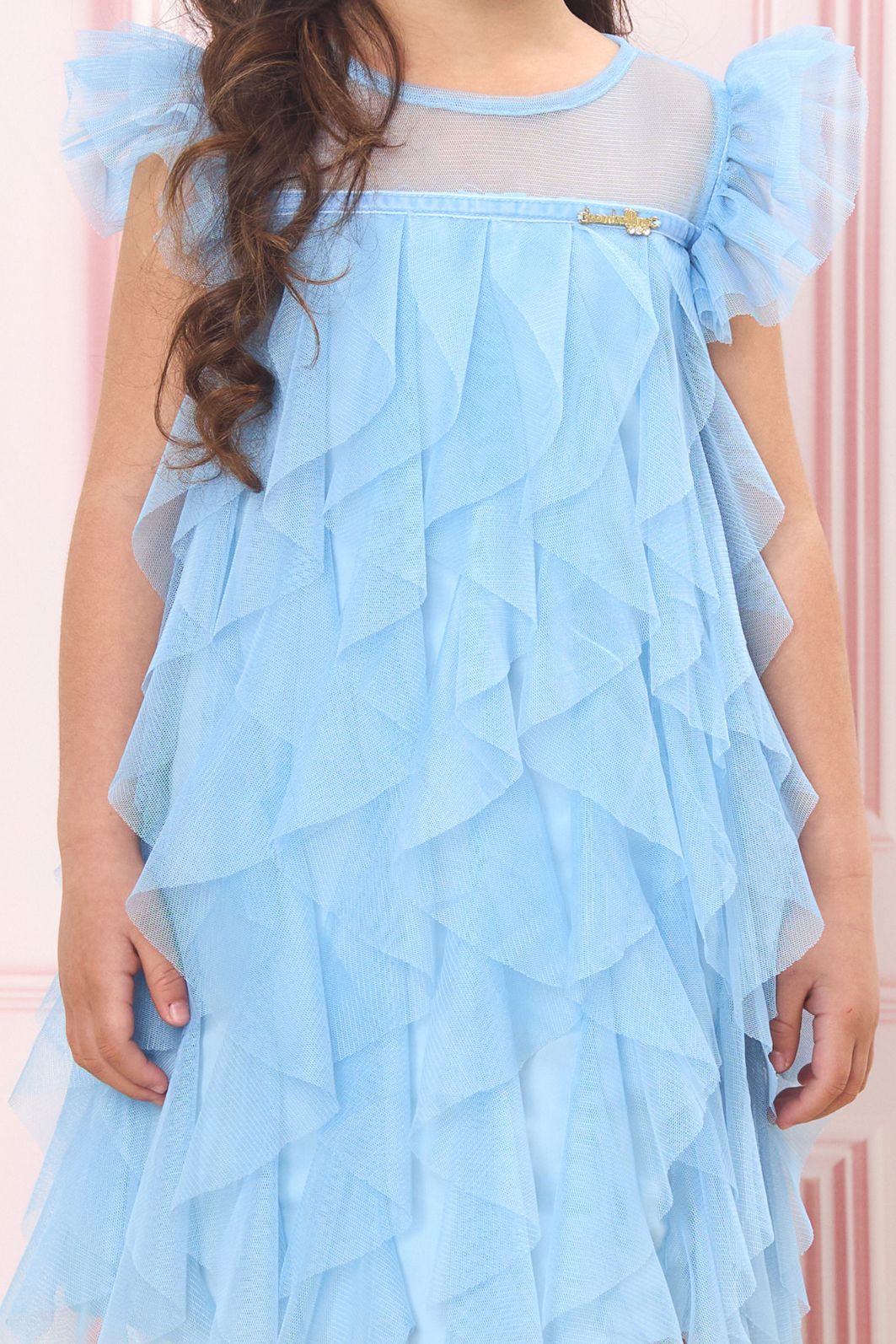 Descrição | O vestido é na cor de azul claro, com um tom suave e encantador, ideal para ocasiões especiais. Confeccionado em camadas de tule, o que dá ao vestido um visual leve, esvoaçante e texturizado. As camadas são dispostas em ângulos sobrepostos, criando um efeito de movimento e volume. A parte do busto possui uma transparência sutil na região do colo, feita de tule, criando um decote discreto e sofisticado. O vestido tem mangas curtas com babados de tule. |