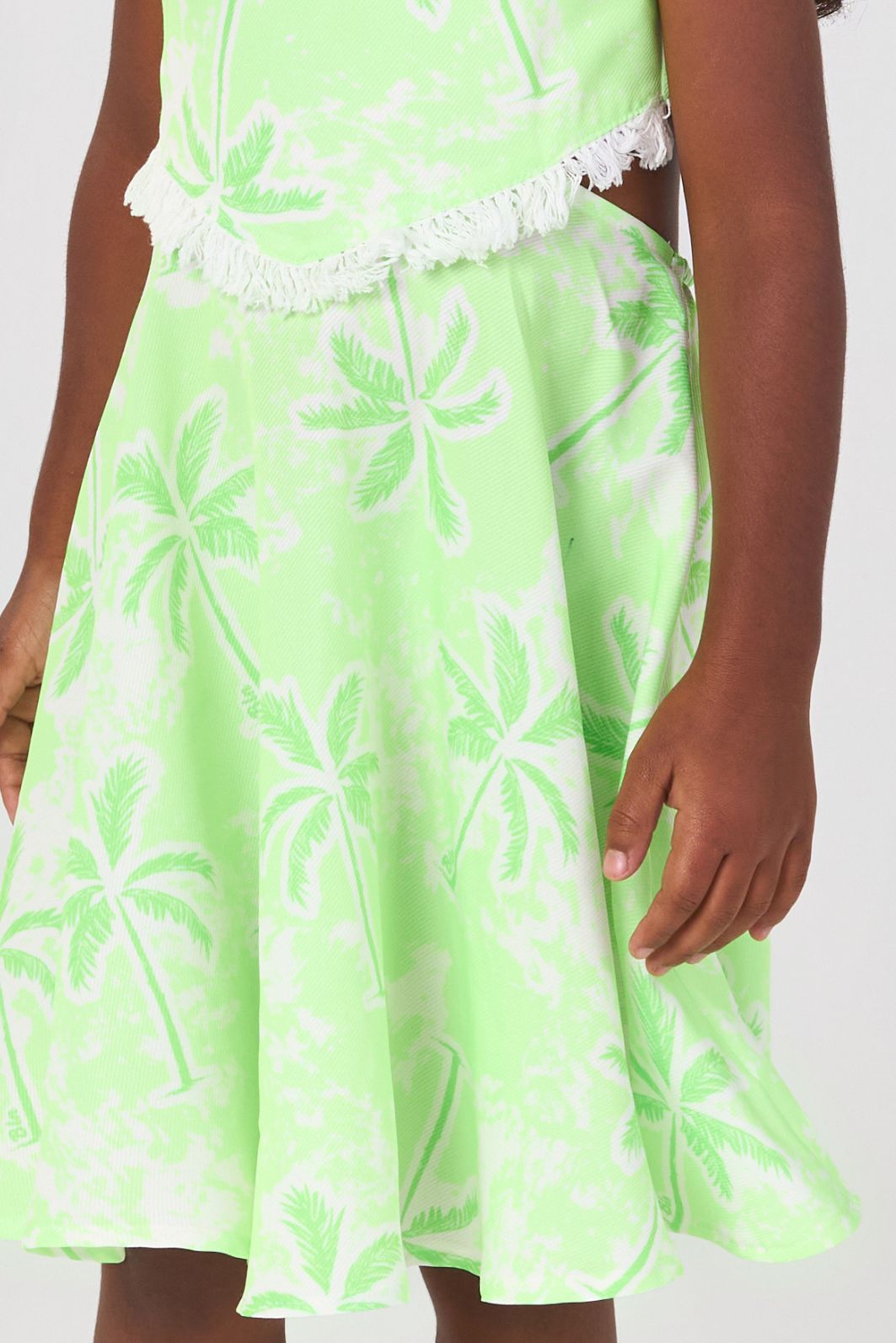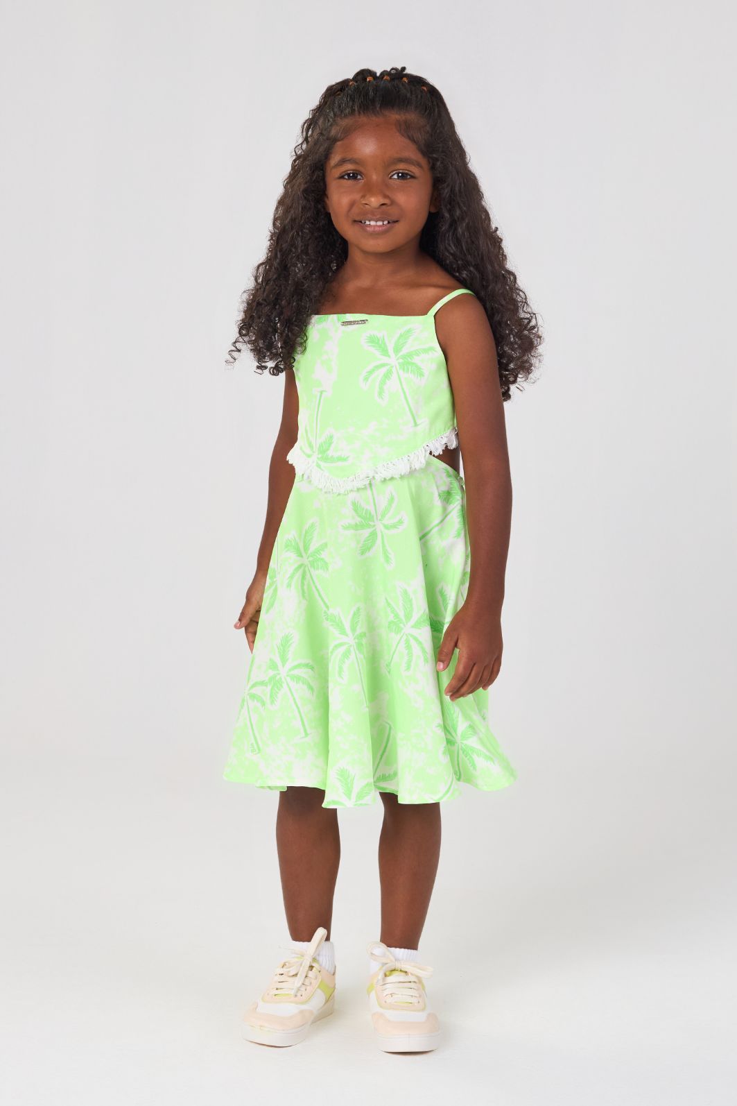 | Descrição | Vestido infantil confeccionado em tecido neon com estampa de coqueiros, possui alças finas e decote reto. Apresenta recorte na cintura com detalhe vazado lateral, saia rodada com bom caimento e modelagem confortável, ideal para looks modernos e frescos. |